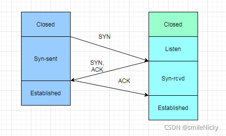 1、 首先,服务端和客户端都是处于CLOSED状态的,然后服务端启动,监听端口,状态变为LISTEN(监听)状态 2、客户端为了请求资源,发送连接,发送同步序列号SYN,此时客户端就变成了SYN-SEND状态 3、服务端接收到客户端请求之后,发送SYN和ACK,然后服务端状态就变成SYN-RCVD状态 4、客户端接收到信息之后,再次发送ACK,然后变成ESTABLISHED(已确认)状态,服务端接收到返回信息后,状态也变成ESTABLISHED(已确认)状态